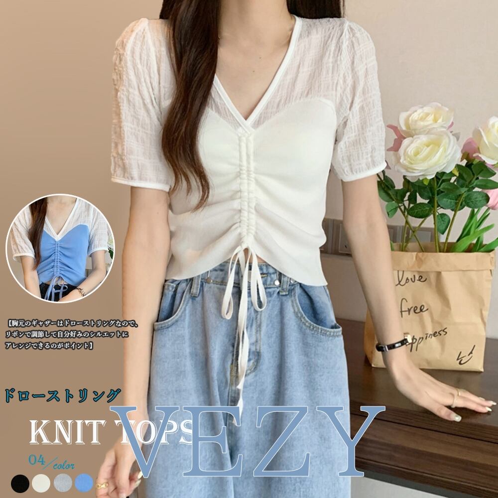 ニットトップス ドローストリング 韓国風 ドッキングニット 異素材切り替え ブラウス 薄手 ニットシャツ細身 ショート丈ブラウス お洒落 シャツ ブラウス ベジー VEZY ItemNo.【17605054 】