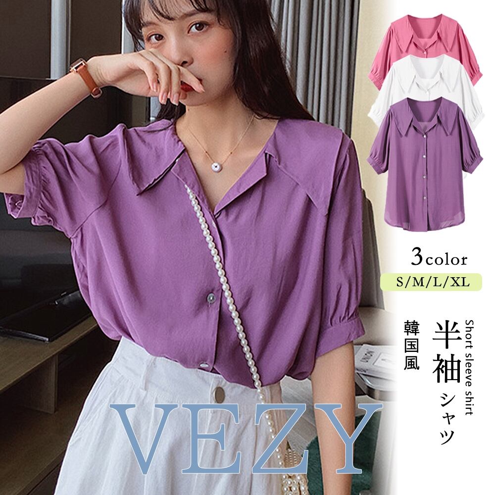 半袖シャツ 無地 夏 韓国 ブラウス 前開きトップス 襟付き Vネック ルーズ シルエット サマー 着やせ オルチャン かわいい シンプル シャツ ブラウス ベジー VEZY ItemNo.【17429316 】