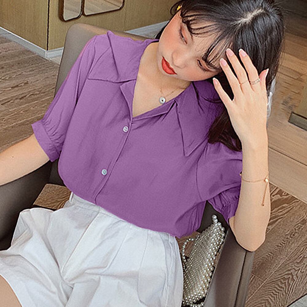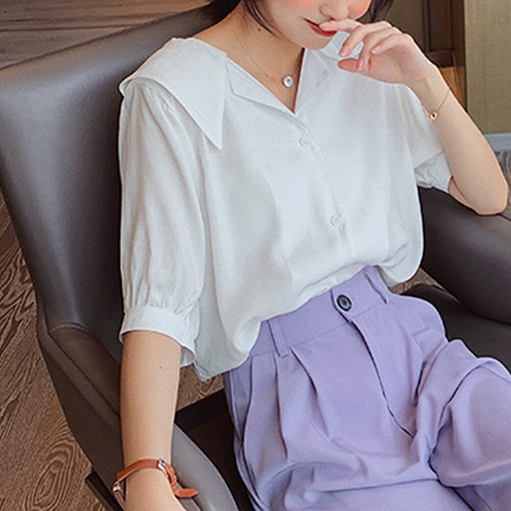 ブラウス 前開きトップス 襟付き Vネック ルーズ シルエット サマー 着やせ オルチャン かわいい シンプル