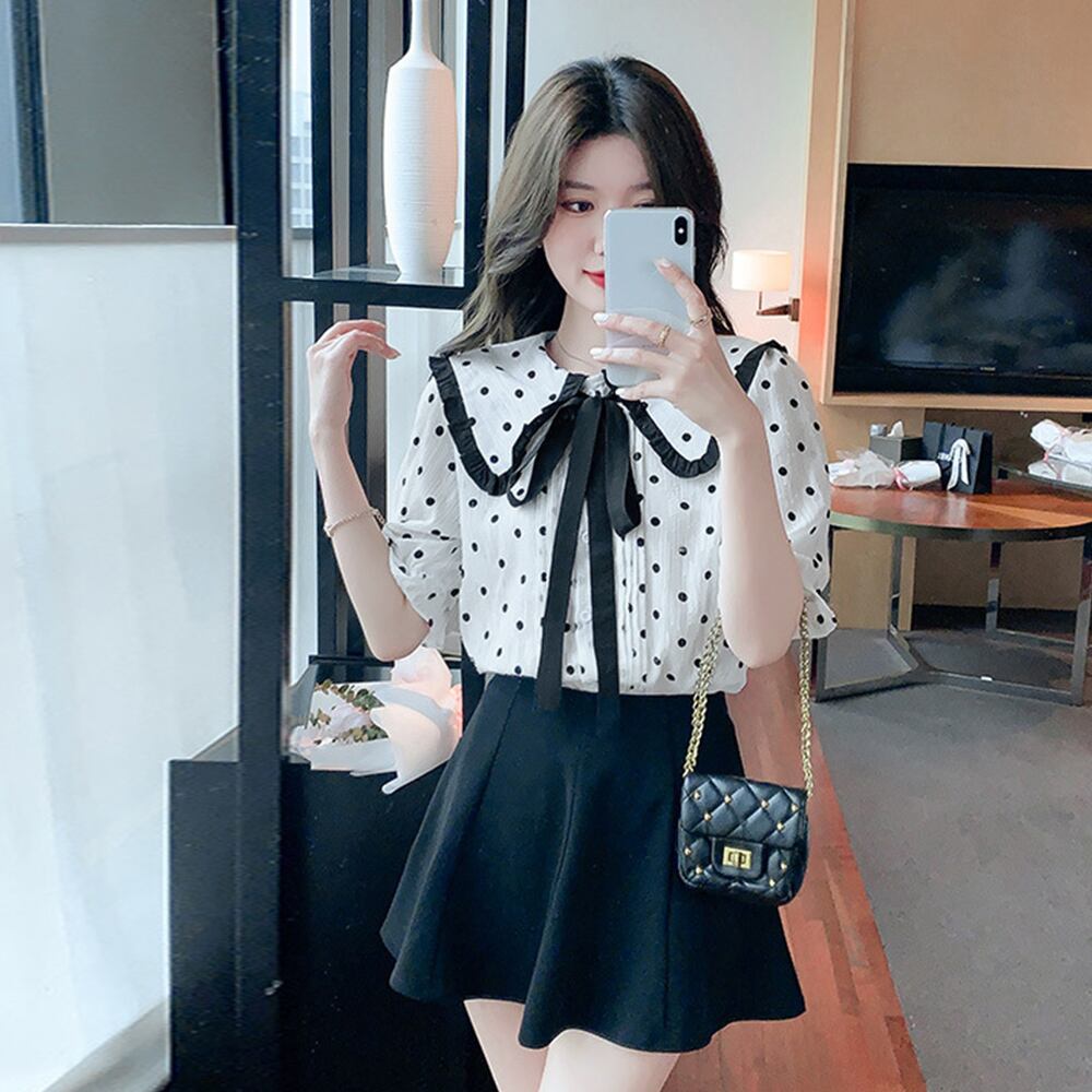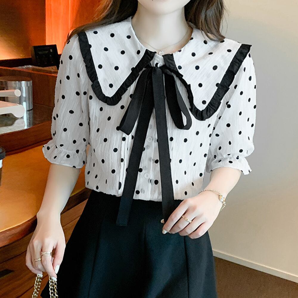 可愛い セーラーカラーブラウス 水玉シャツブラウス 半袖 シフォンブラウス リボンタイブラウス 春夏秋 袖フリルレトロ風