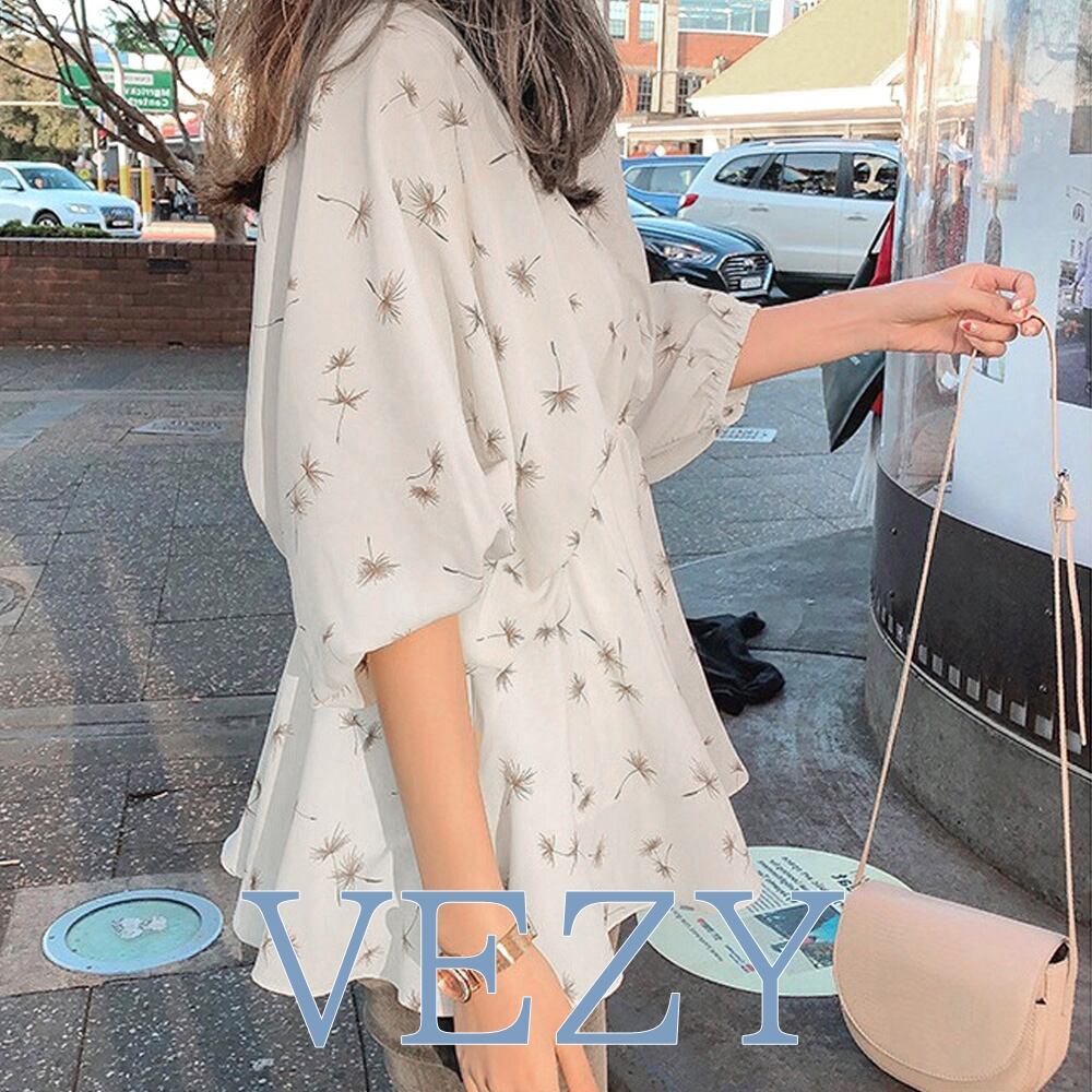 フレア シャツブラウス 夏服 ボリューム袖 柄シャツ トップス 着やせ ゆったり Vネック シフォンブラウス パフスリーブ カジュアル 大人エレガント シャツ ブラウス ベジー VEZY ItemNo.【17605039 】