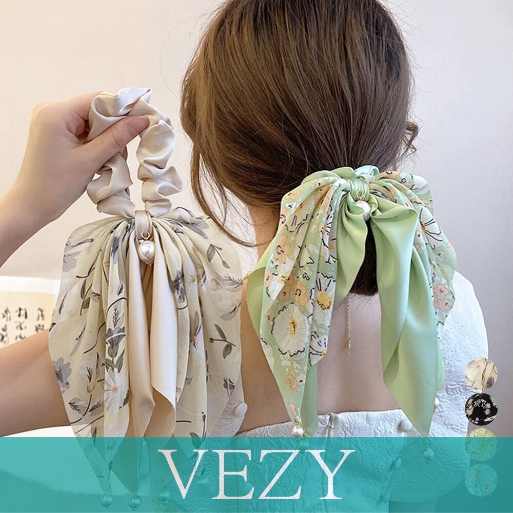 花柄 スカーフシュシュ春夏リボンヘアゴム おしゃれ フラワープリント 蝶結びヘアアレンジ 上品 大人可愛い ヘアアクセサリー 大きめ まとめ髪 韓国風 髪留め クリップ ヘアアクセ ベジー VEZY ItemNo.【19078202 】