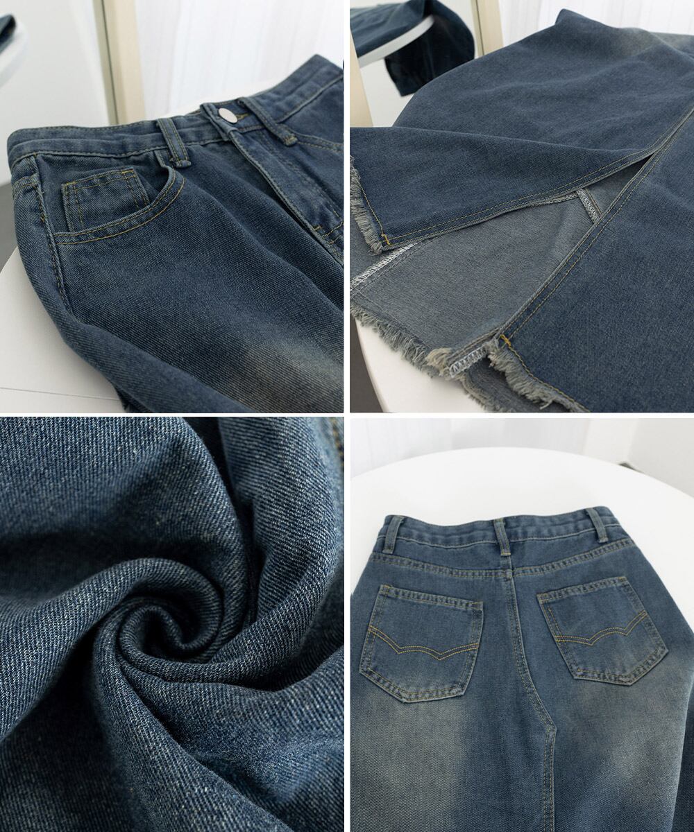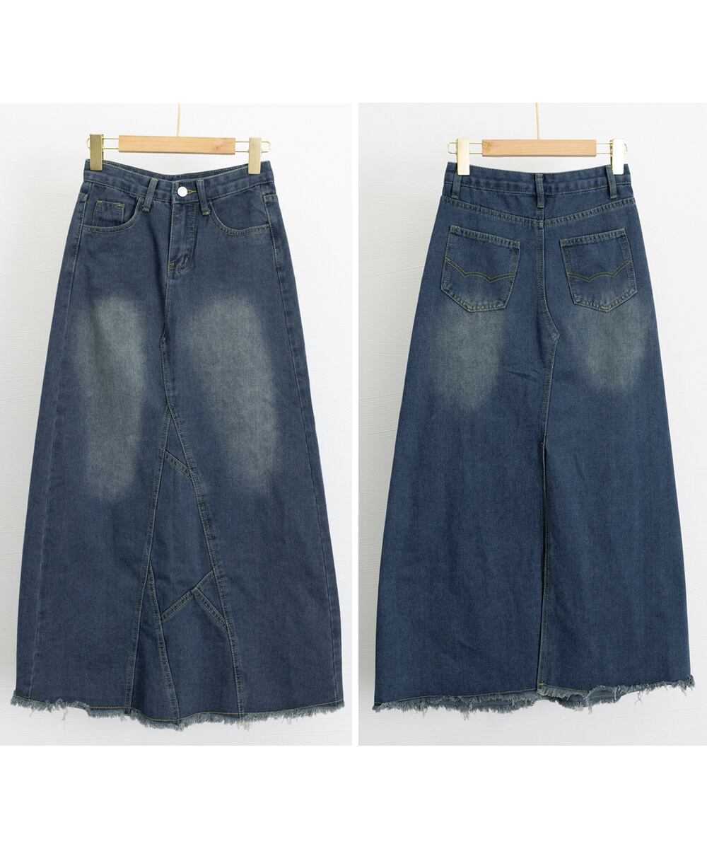 デニムロングスカート バックスリット韓国 ヴィンテージ デニムスカート 裾フリンジロングスカート ハイウエストAラインスカート 体型カバーブリーチ加工 パンツ スカート ベジー VEZY ItemNo.【20563872 】