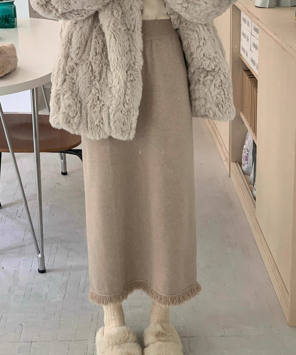 体のラインを拾いすぎないセミタイトが女性らしい着こなしを演出する裾フリンジニットスカート