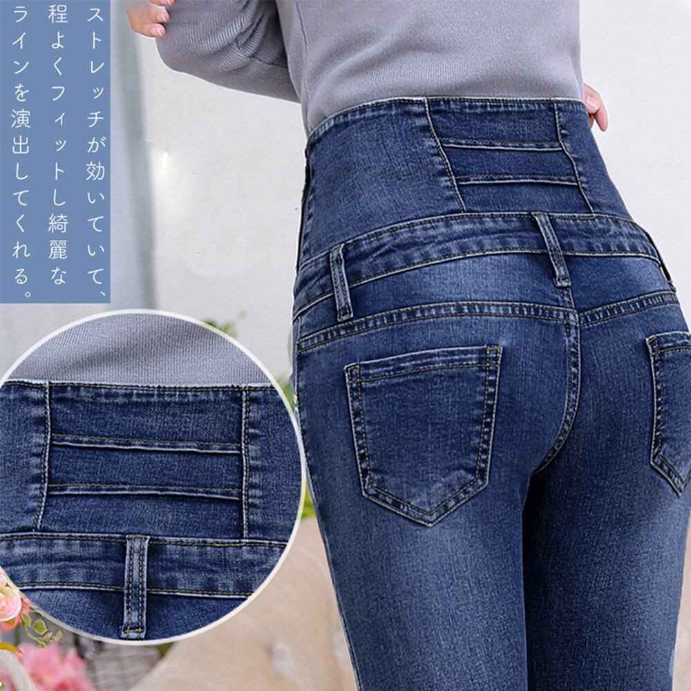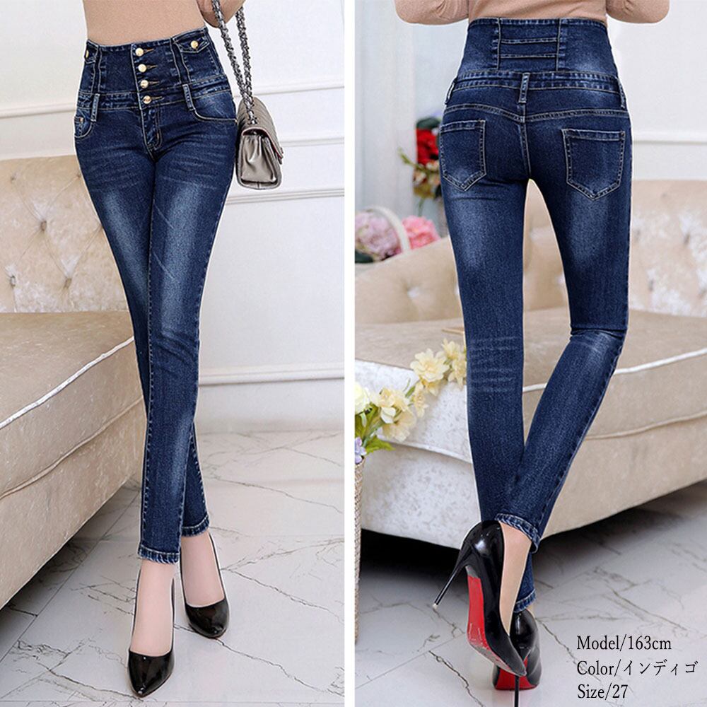 脚長、スタイルアップ抜群のハイウエストボタンスキニーデニムパンツ
