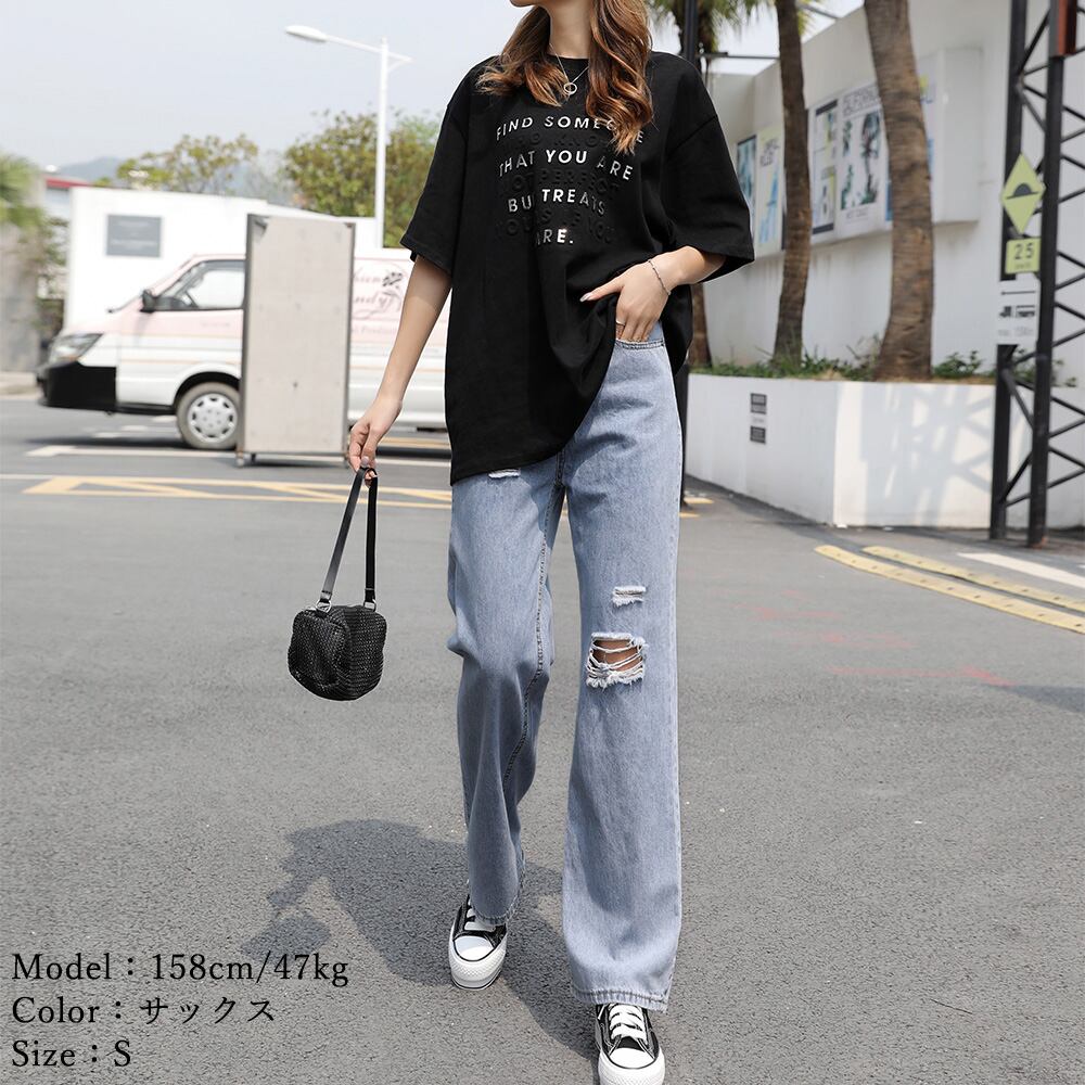 レディース ダメージ加工 デニムワイドパンツ ハイウエスト ロングパンツ 着やせ ゆったり おしゃれ 20代 30代